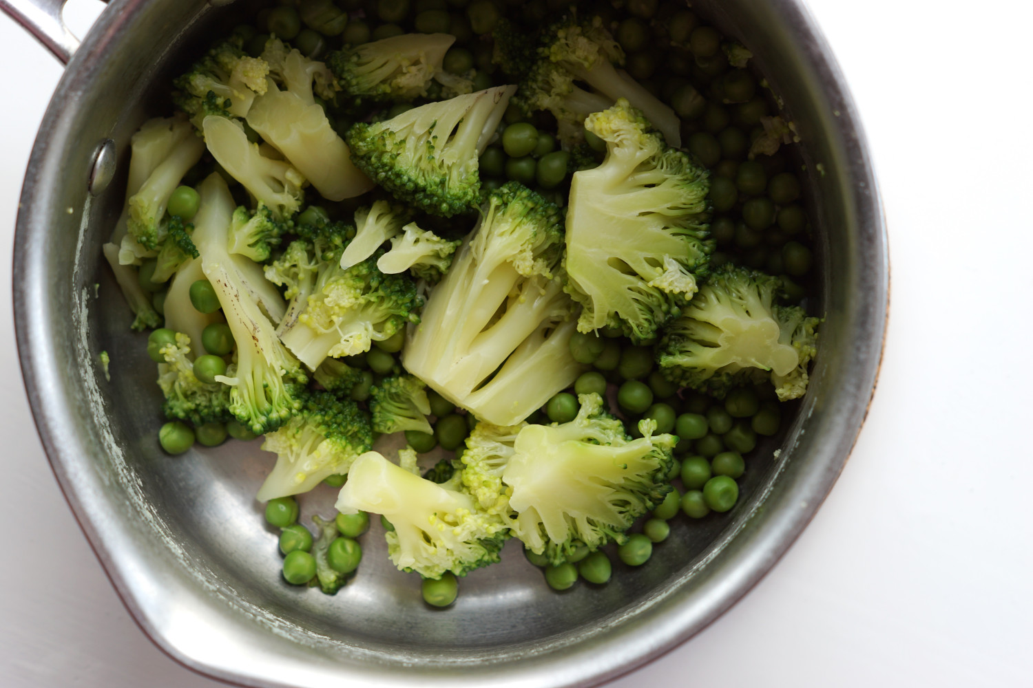 Kom broccoli og ærter i en gryde og dæk med rigeligt vand.