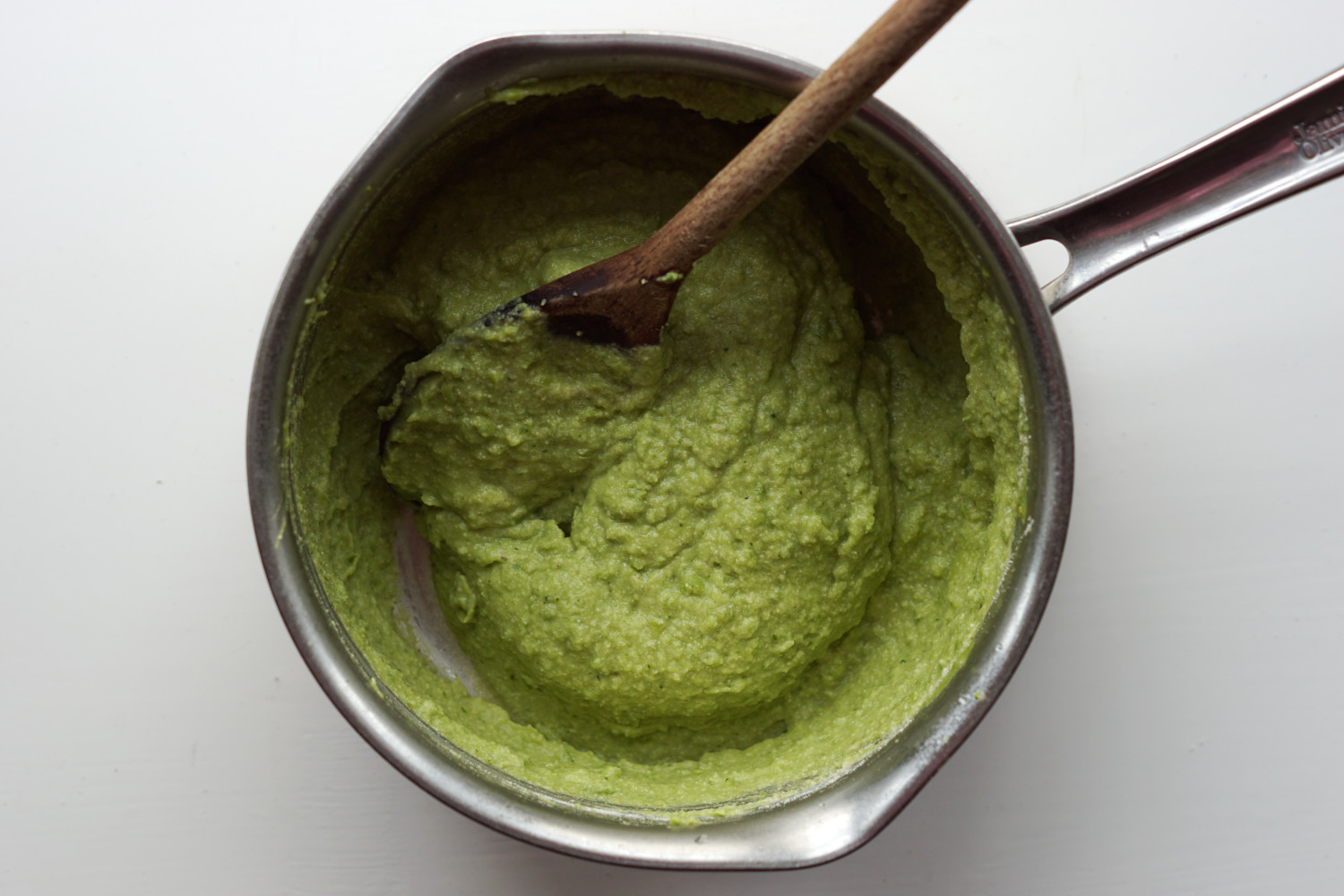 Blend nu den kogte broccoli og ærterne til en hel fin konsistens (brug en stavblender) imens du tilsætter de 2 dl vand lidt ad gangen.