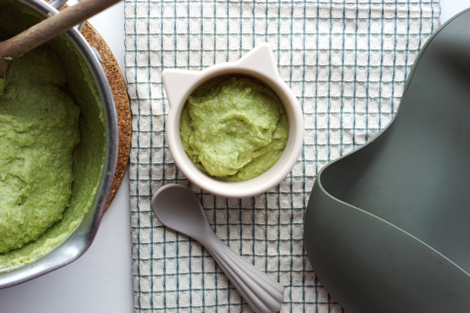 Mild begyndergrød baseret på grøntsager – broccoli og ærter – og med et strej af muskatnød. Grøden indeholder hirsemel, så den får en bedre mæthed end en klassisk grøntsagsmos.