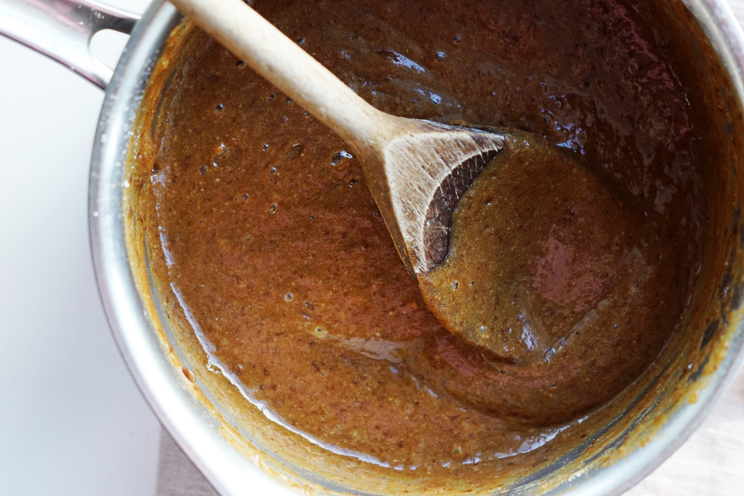 Brug en stavblender til at blende sveskerne til en helt fin sveskemos imens du tilsætter de 3 dl kogevand. Tilsæt boghvedemel og rugmel og rør godt sammen. Kom tilbage på komfuret og varm op til sveskemosen tykner en lille smule.