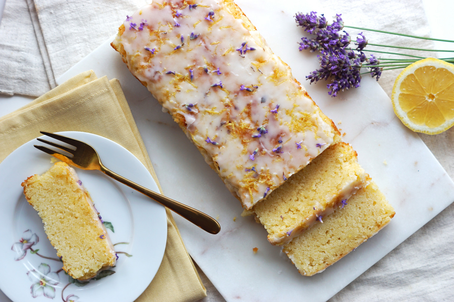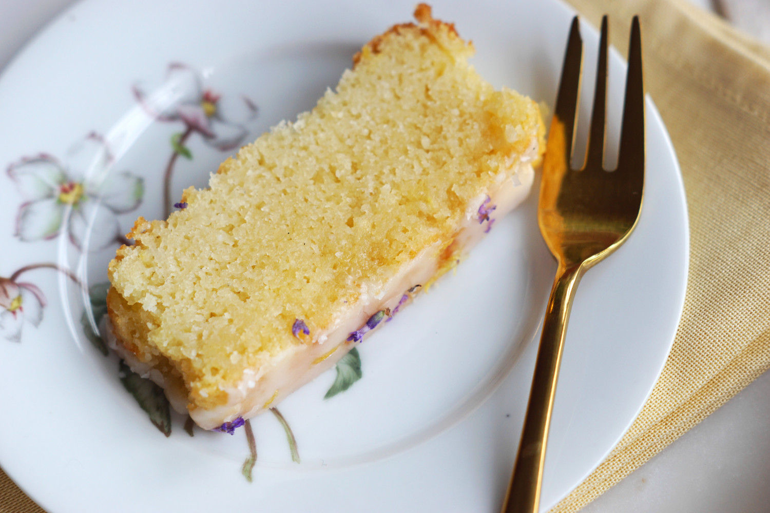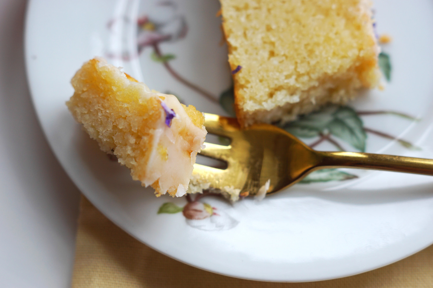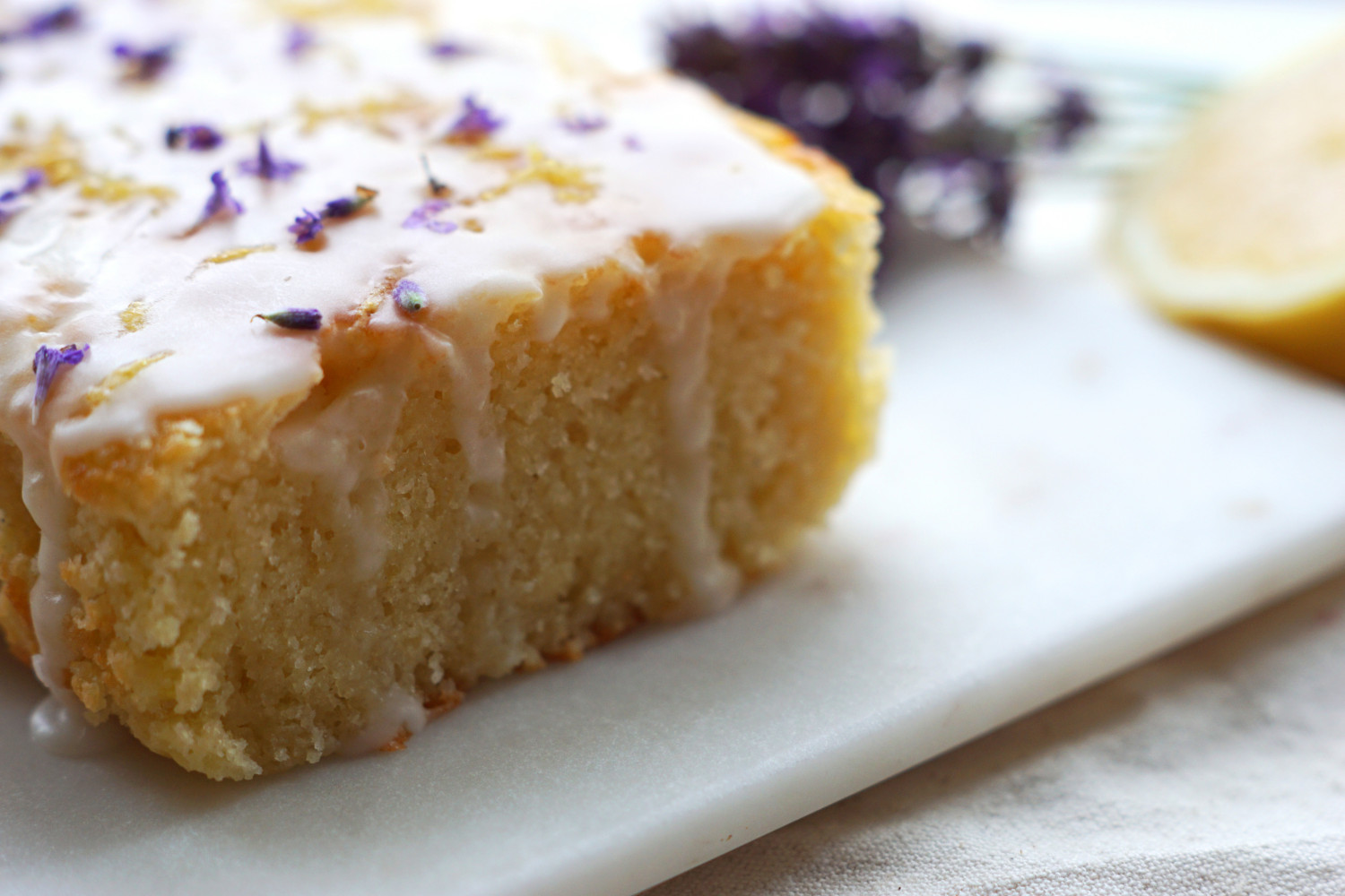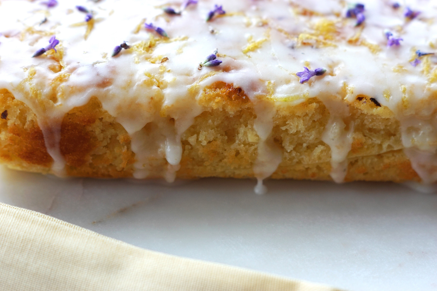 Lad kagen køle helt af. Bland en tynd glasur af friskpresset citronsaft og flormelis. Den må endelig ikke være for tyk. Der skal kun et tyndt lag på kagen og det må gerne løbe lidt ned af siderne. Drys med citronskal ovenpå kagen, når glasuren er fordelt over den. Jeg har desuden drysset med lavendel som jeg synes ser så fint ud på den gule kage.