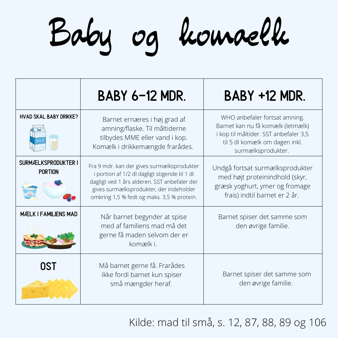 Så enkelt lyder det i Sundhedsstyrelsens (SST) anbefalinger. Læser man generelt anbefalingerne fra SST, så er der et fokus på at komælk især indtil 9 måneders alderen kun indgår meget begrænset i barnets kost, og fra 9 mdr. kan der ske en lille gradvis optrapning frem mod 1 års alderen og f.eks. gives små portioner yoghurt, lidt komælk på grøden mv.
