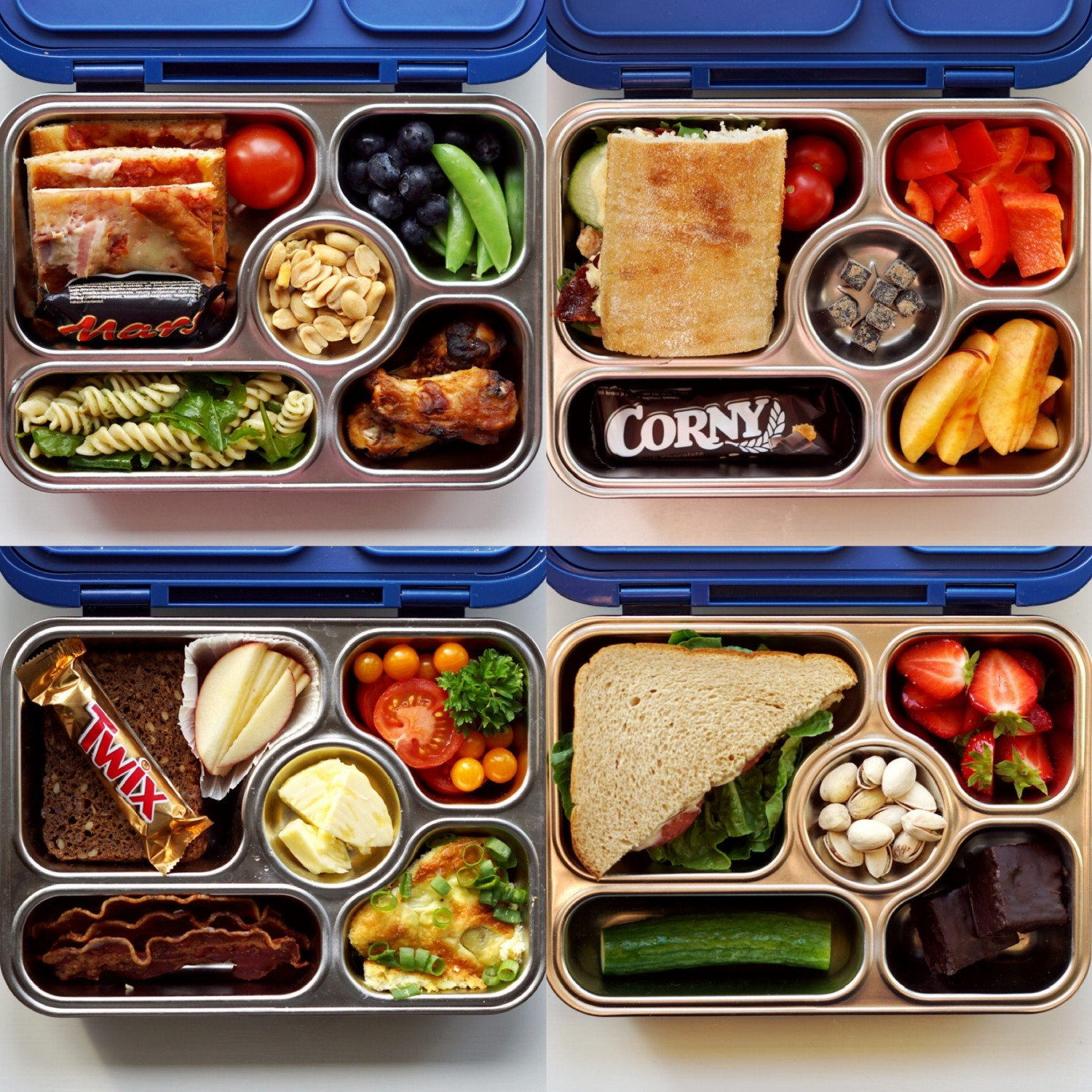 - Pizzafirkanter, cherrytomater, pasta/pesto/rucola, peanuts, sukkerærter, blåbær, hotwings og mini marsbar