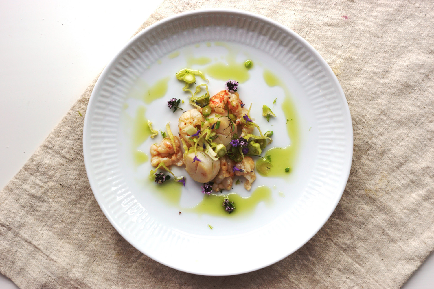 Anret hver tallerken med en kammusling i midten, et par hummerhaler (ca. 5 til hver tallerken), snittet fennikel, fennikelspidser og evt. skovsyre eller spiselige blomster. Se billedet herunder.