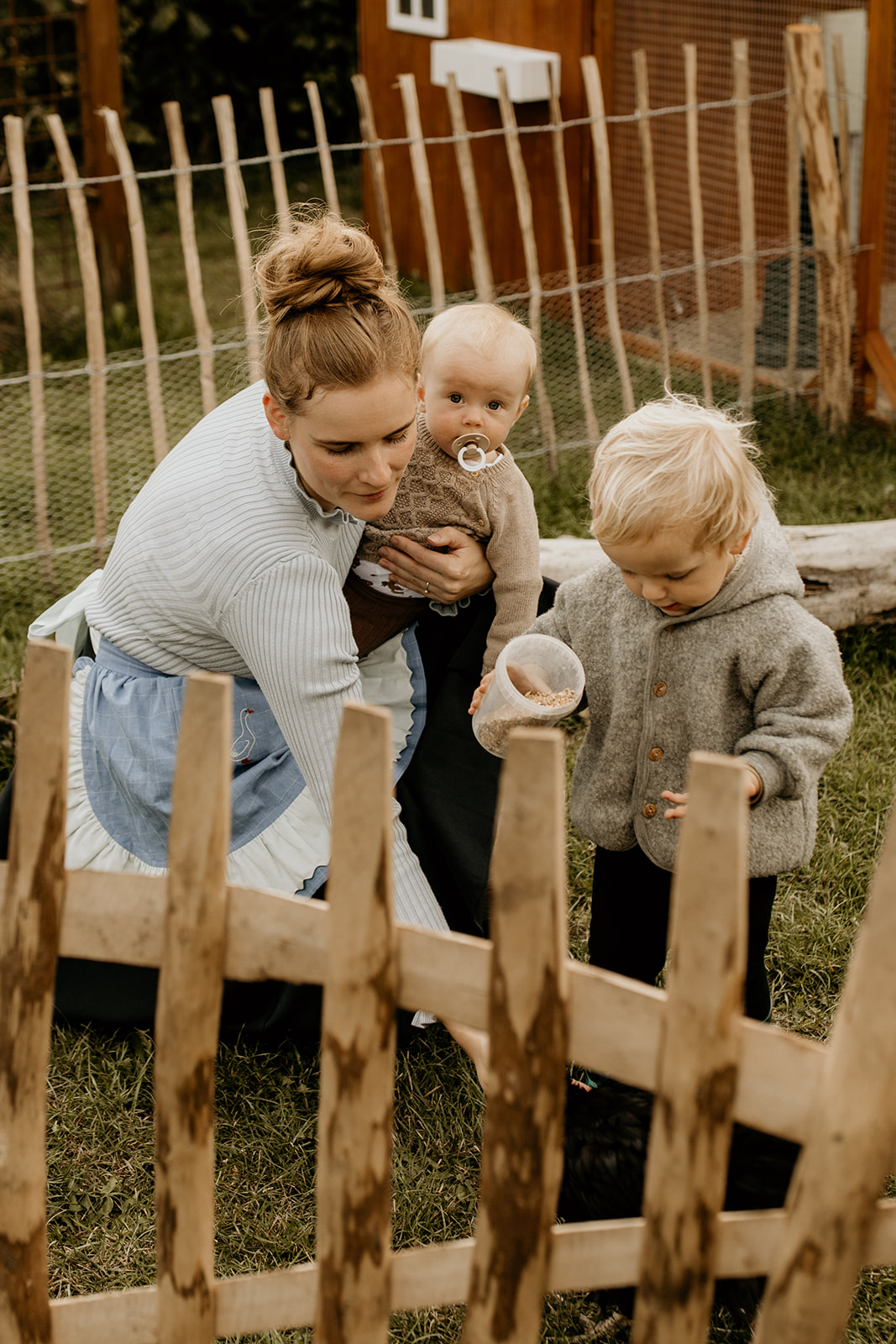 Men de “kedelige” og nødvendige opgaver tager kun ca. 5 minutter: at tjekke de har frisk vand, fodre og så gerne lige rive de værste hønseklatter sammen og hente æg. Derudover lukker jeg dem ud i hønsegården om morgenen og ind om aftenen. Vores hønsehus har dog automatisk hønselem, så de kan selv gå ind og ud i volieren.