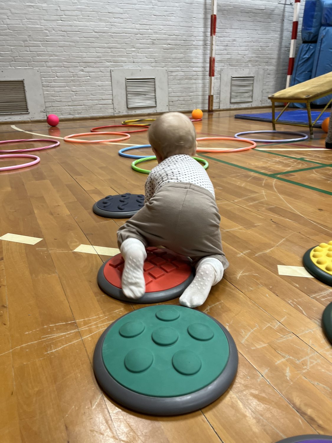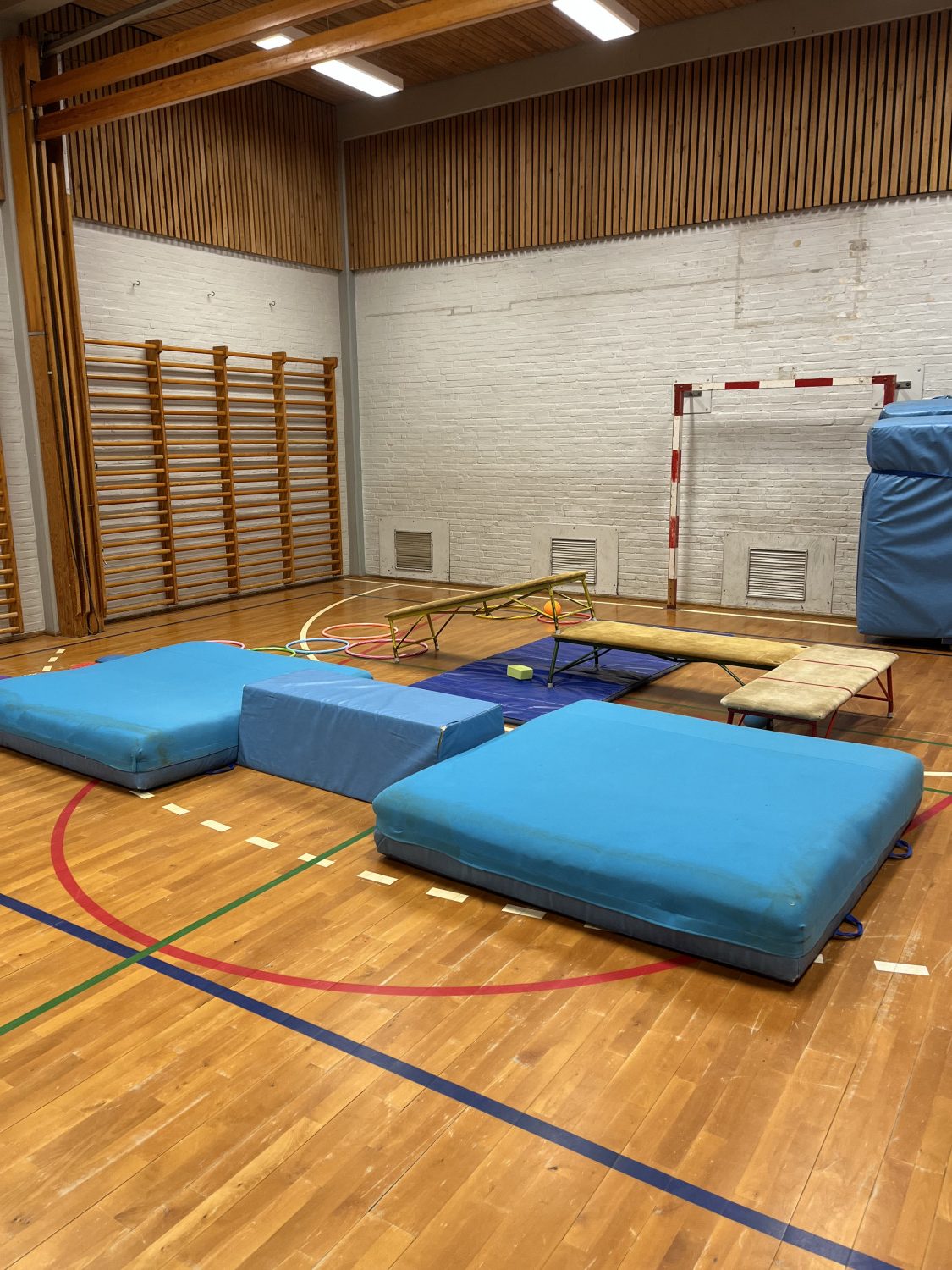 Én gang om ugen har vi lånt os til en gymnastiksal som børnene elsker at slå sig løs i. Det er en lukket aktivitet kun for vores legegruppe.