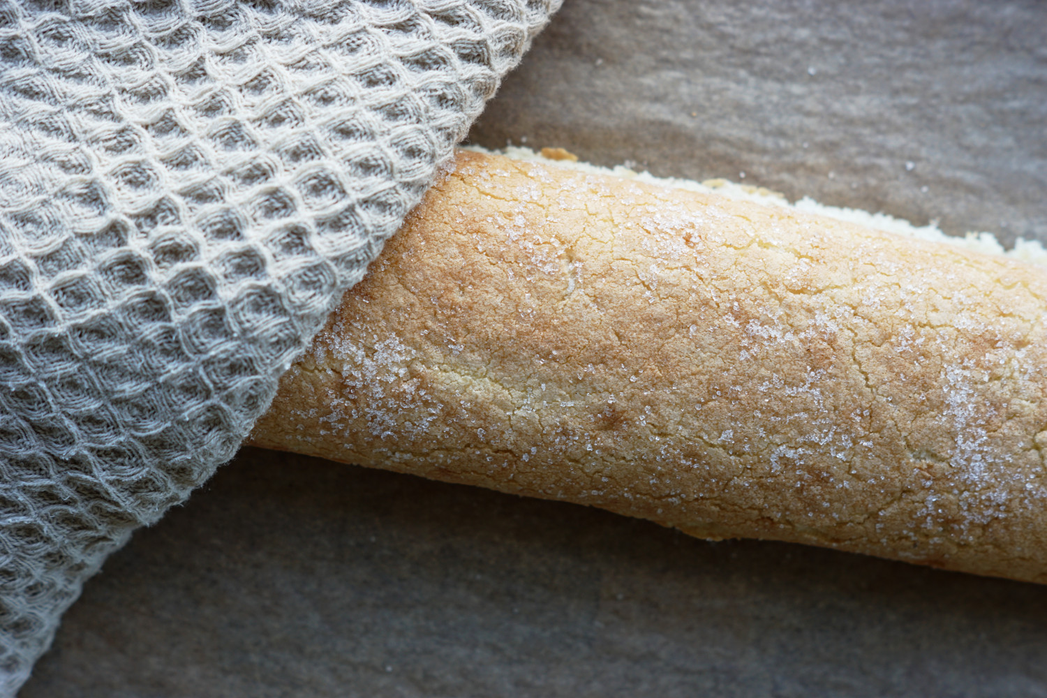 Tag ud af ovnen og dæk straks med et rent viskestykke, så dampen holdes inde på din rouladebund, og den ikke bliver sprød/hård.