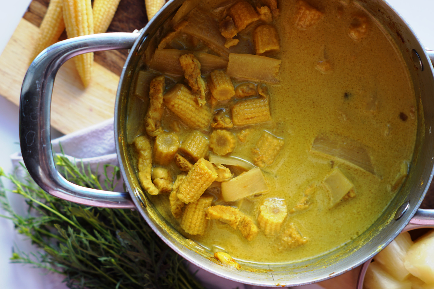 Tilsæt herefter kylling og lad det brune godt af, hvorefter du tilsætter babymajs og bambusskud. Rør godt i retten imens det hele tager farve og skru så ned for komfuret til lav-medium varme. Tilsæt kokosmælken og lad det hele simre under et let løftet låg i 5-8 minutter. Forbered evt. tilbehør imens (lun brød, skær æbletern mv.).