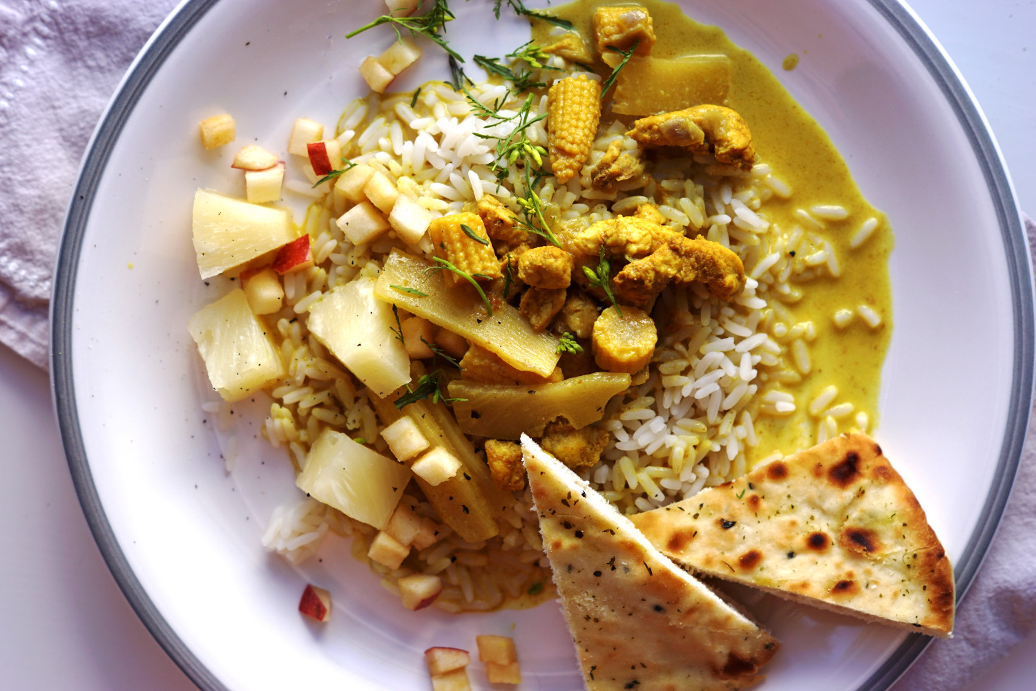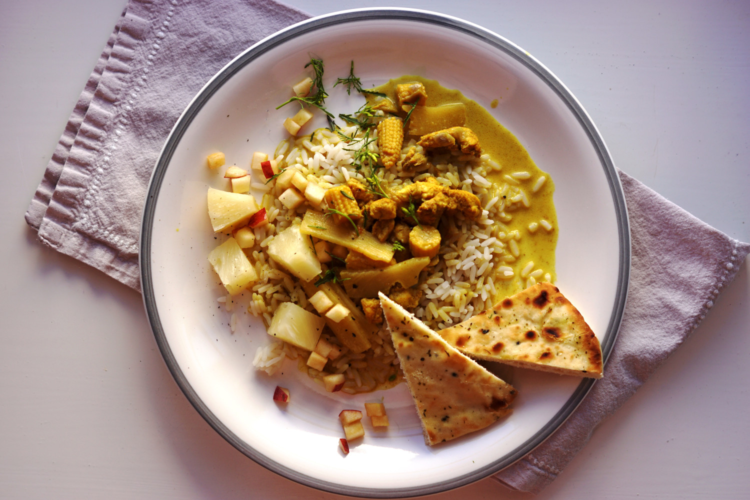 SERVERINGSFORSLAG: Jeg serverer retten med ris, naanbrød, æbletern og ananas til. Man kan også sætte peanuts, kokosmel og rosiner på bordet, som man kan bruge som topping.