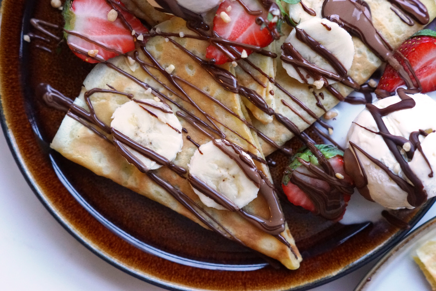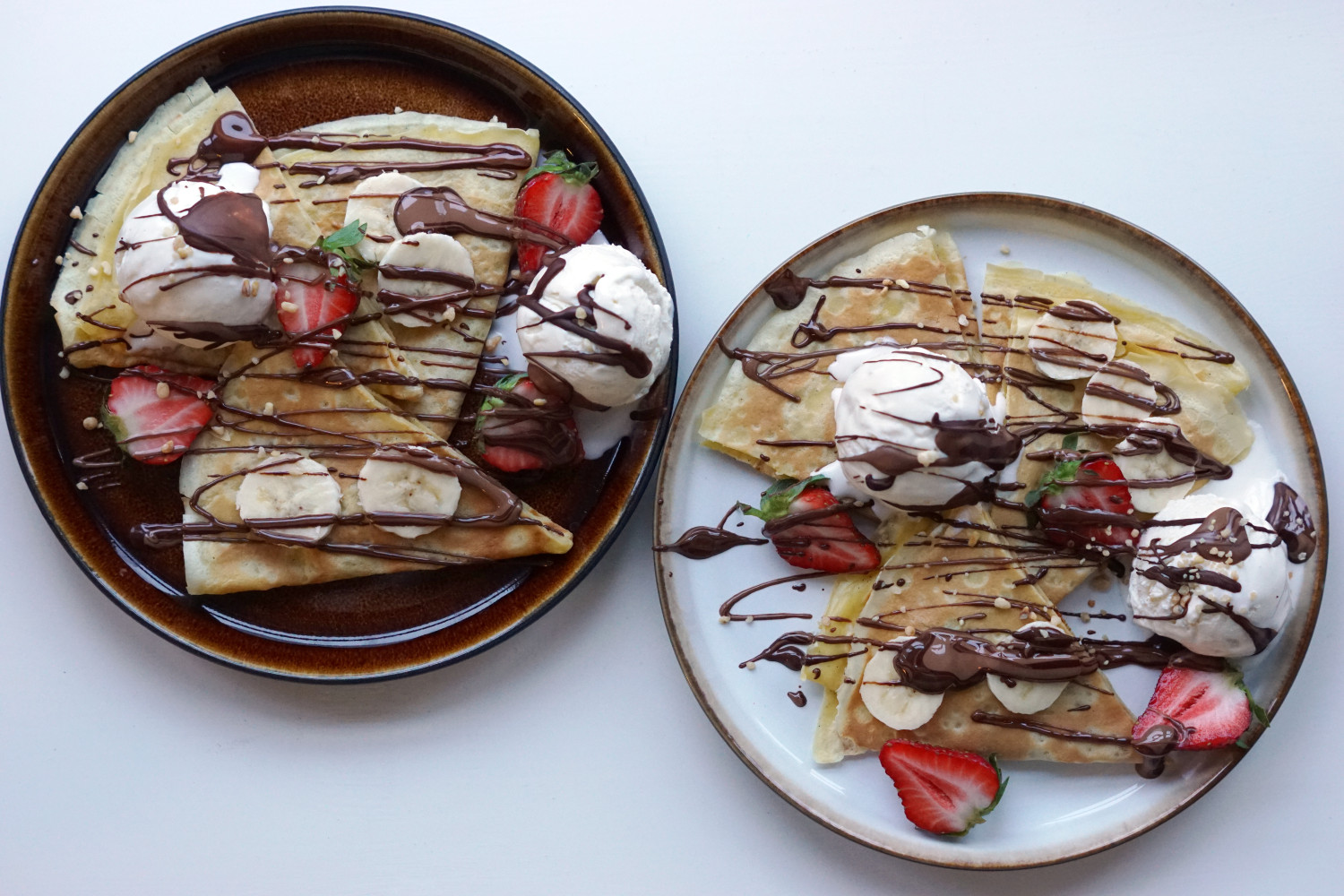 Tynde, bløde, gyldenstegte pandekager! Hvem elsker ikke sådan nogle – enten klassisk med sukker og syltetøj eller som her, som den perfekte dessert med selskab af vaniljeis, chokoladesovs, banan, jordbær og nøddekrokant.