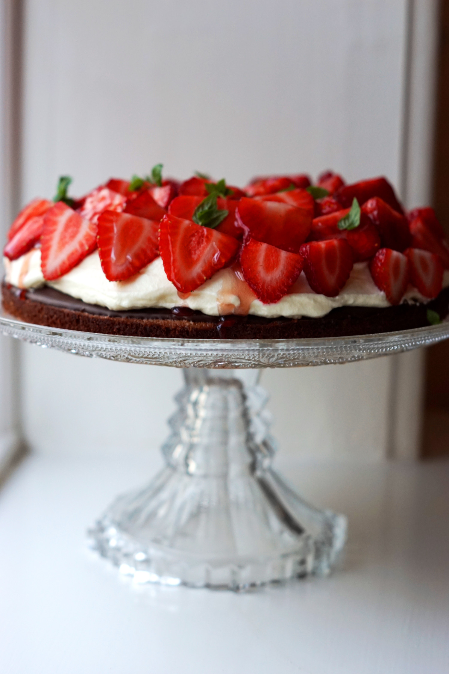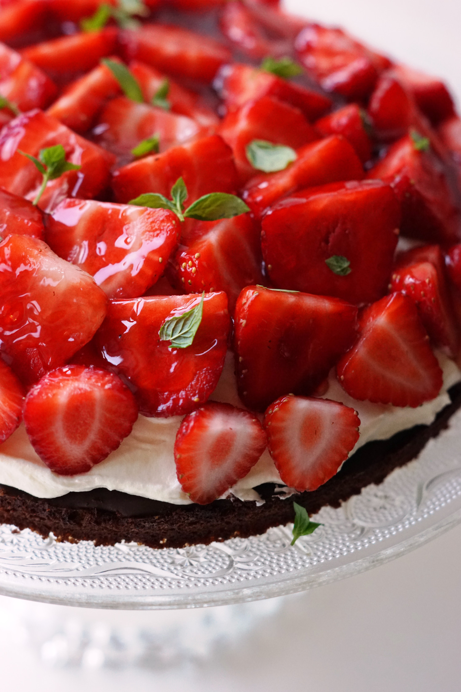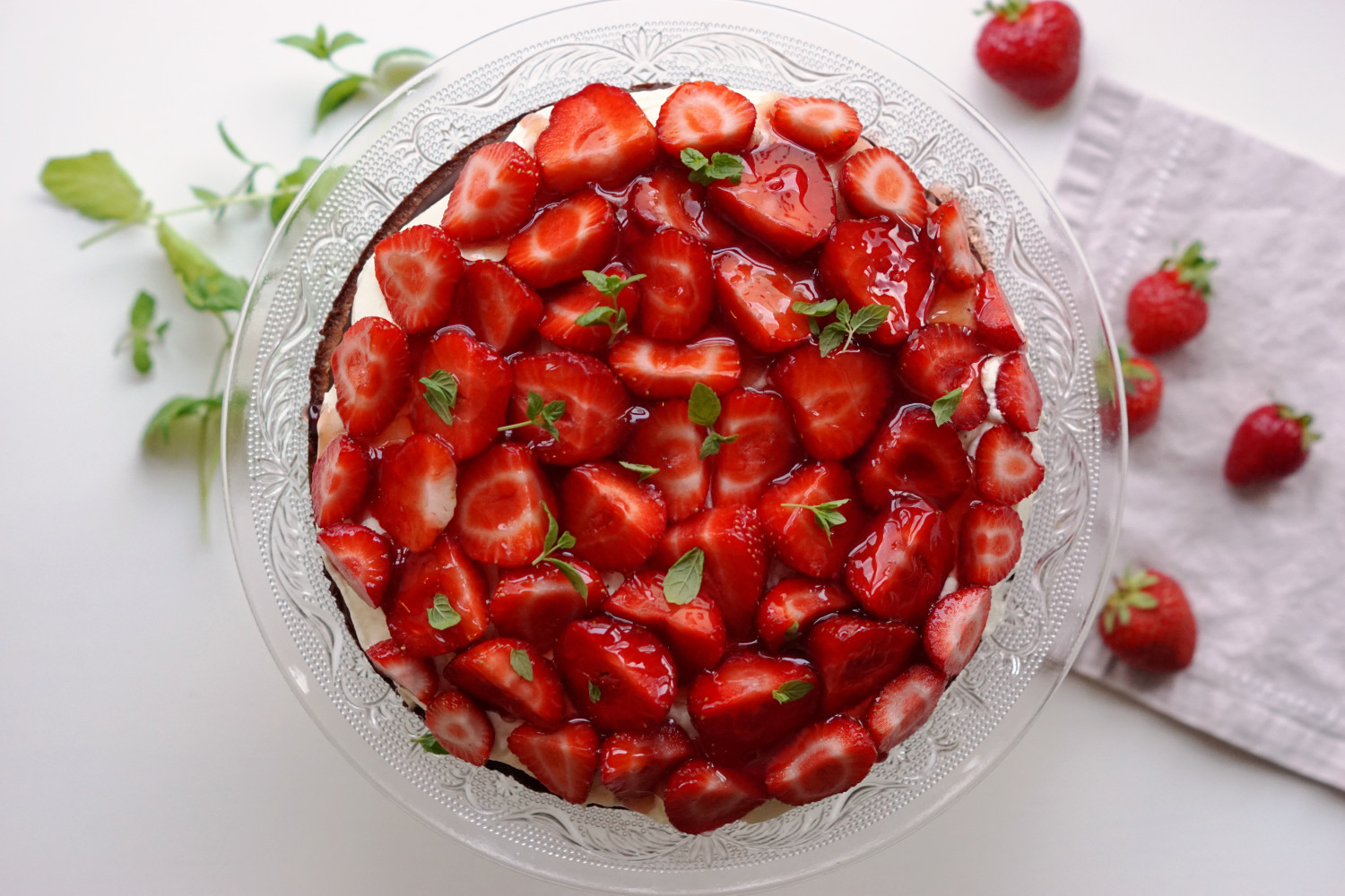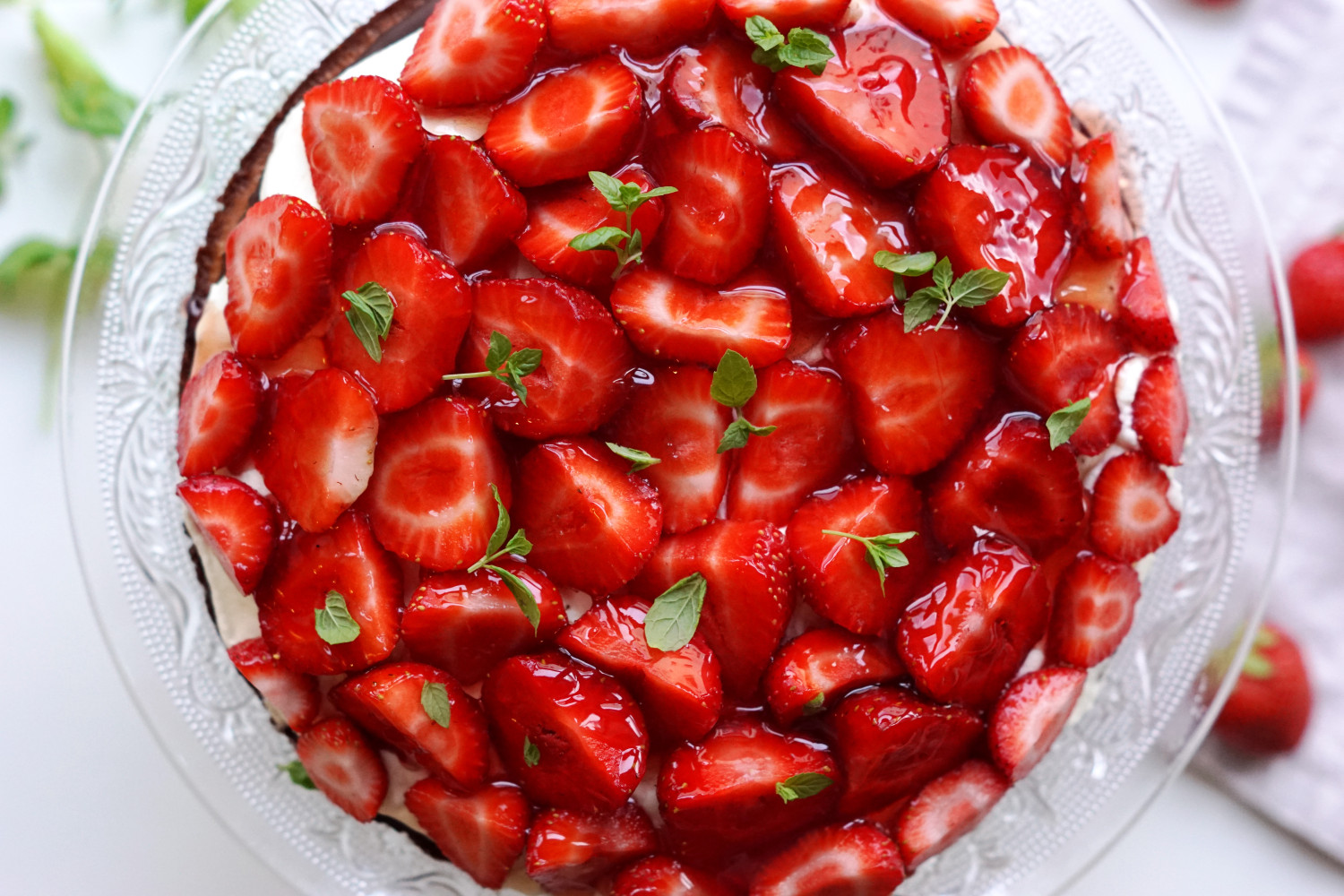 Drys evt. med lidt friske myntheblade eller andet (se forslag i ingrediensliste) for at din jordbærtærte tager sig ekstra elegant ud.