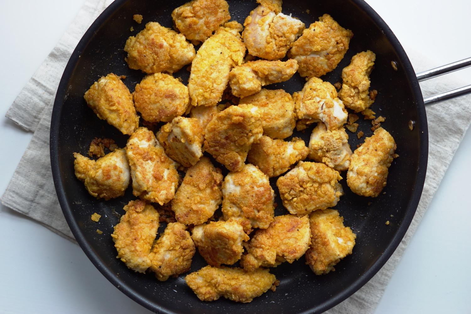 Min familie elsker disse hjemmelavede nuggets som er alt andet end at sammenligne med dem man kender fra fryseboksen i supermarkedet eller diverse fastfoodrestauranter. De er lavet på hele stykker saftigt kyllingekød og vendt i den sprødeste majsblanding. De er et kæmpe hit hjemme hos os, og oprindeligt nogle min mor ofte lavede – det er der jeg har opskriften fra. Med de hjemmelavede nuggets er der nem og lækker hverdagsmad. Suppler blot med lidt ovnbagte kartoffelbåde og en grøn salat eller måske med en pastasalat til med alt godt fra grøntskuffen. Og naturligvis mayonnaise at dyppe de sprøde nuggets i.