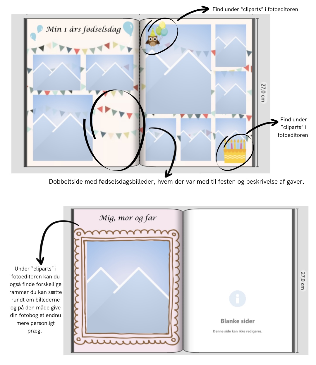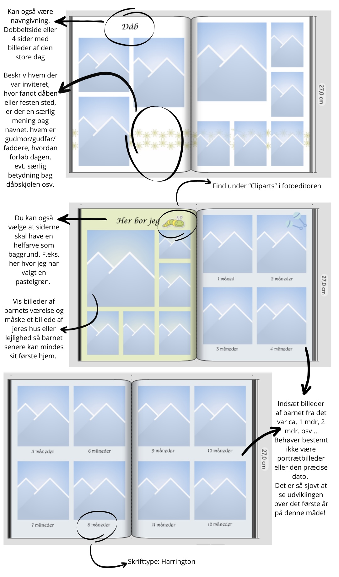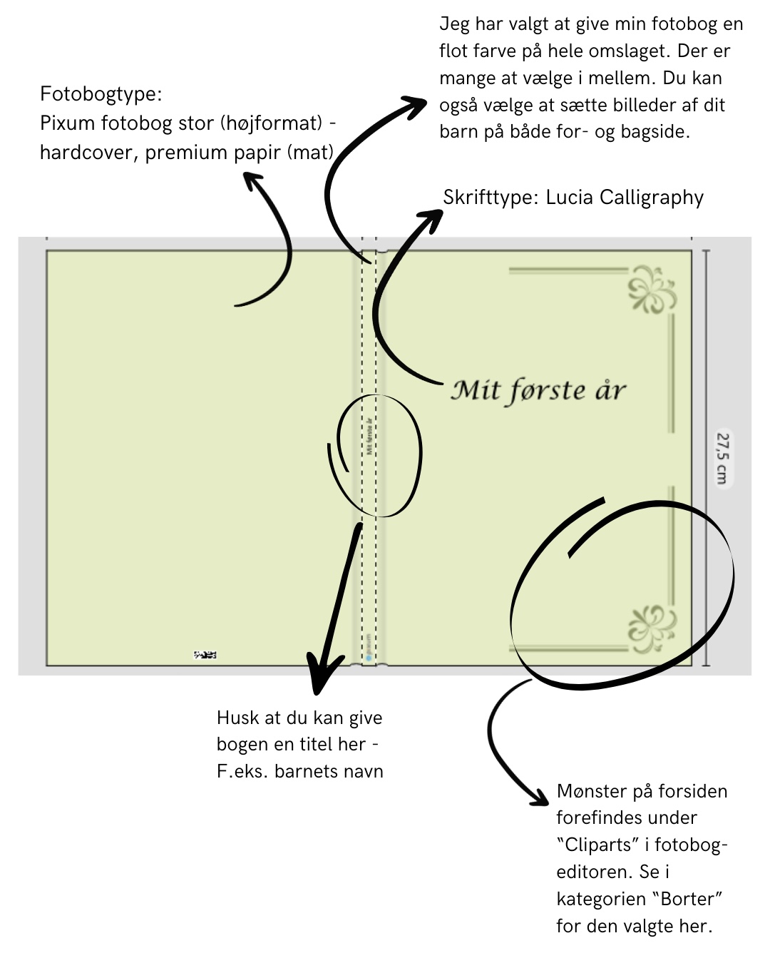 Du kan selv vælge om den skal hedde “Barnets Bog”, “Mit første år” eller “Mine første år”. Alt efter hvad du synes passer med lige præcis den bog du gerne vil lave.