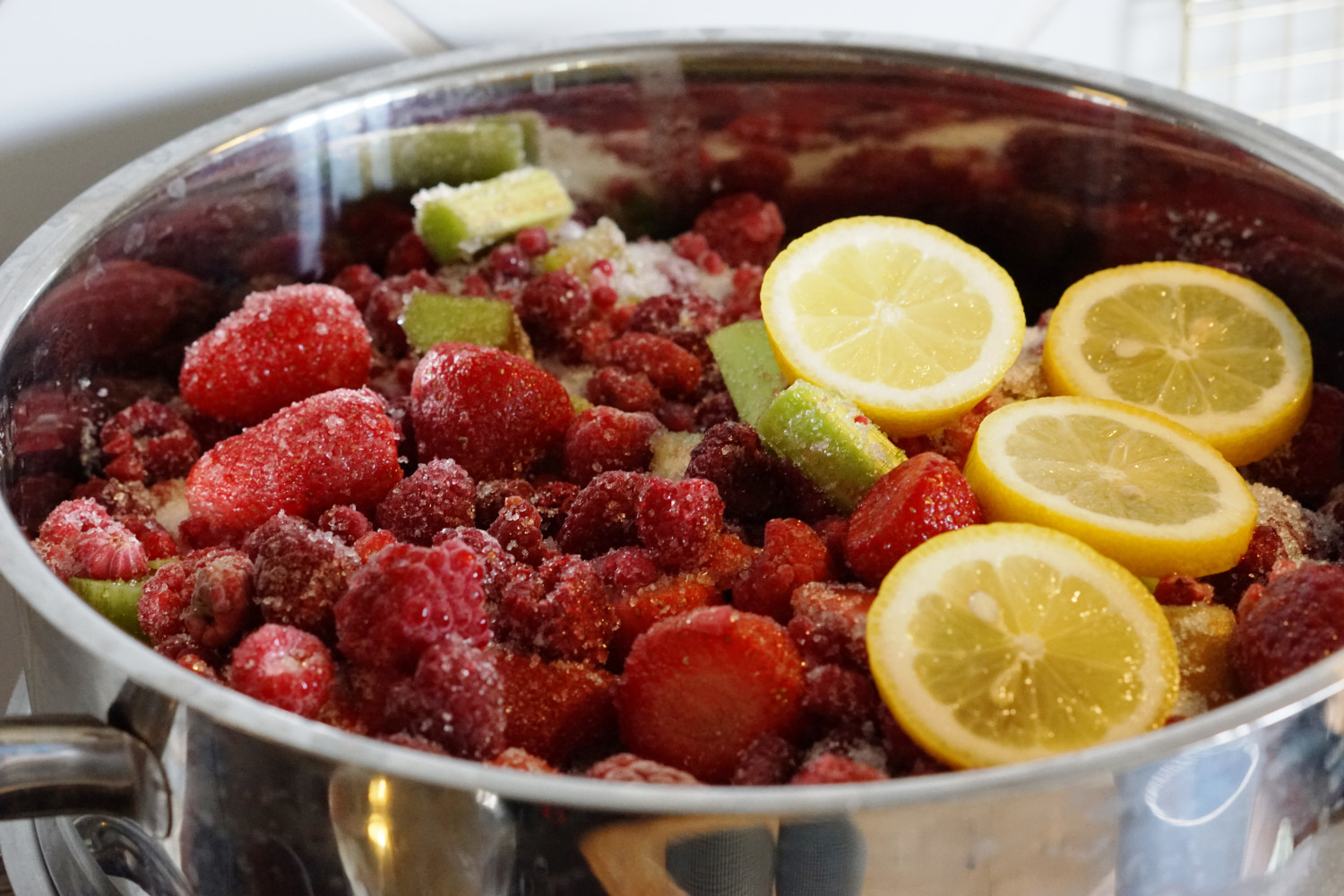 Lad saftkogeren koge i 10 minutter og løft herefter låget af og vend forsigtigt lidt i rabarber og bær. Kom låget på igen og lad det hele koge i 15-20 minutter mere.
