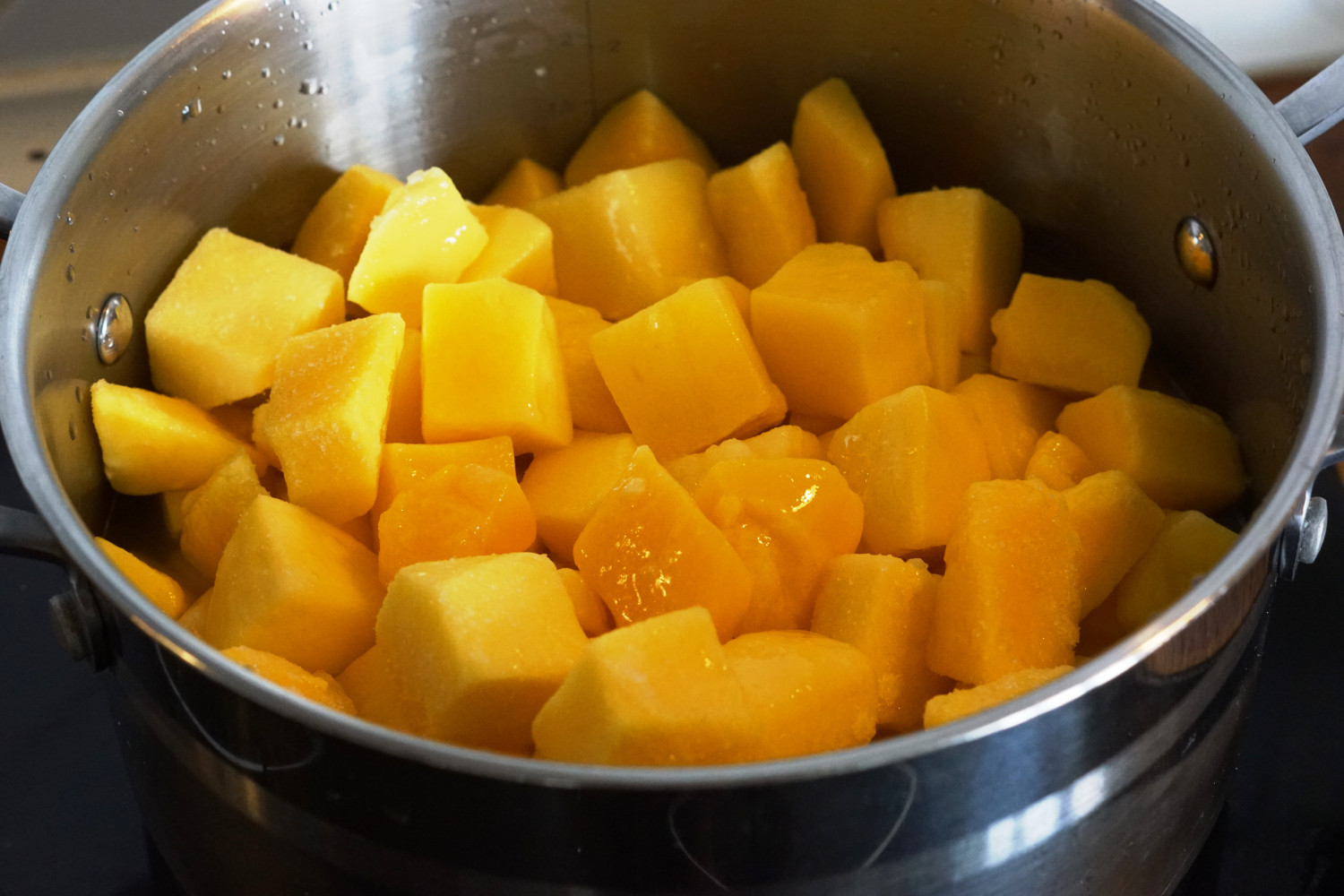 Kog mango møre halv dækket af vand og uden låg i en stor gryde. Kog så meget vand væk som muligt, men pas på at mangoen ikke brænder på.