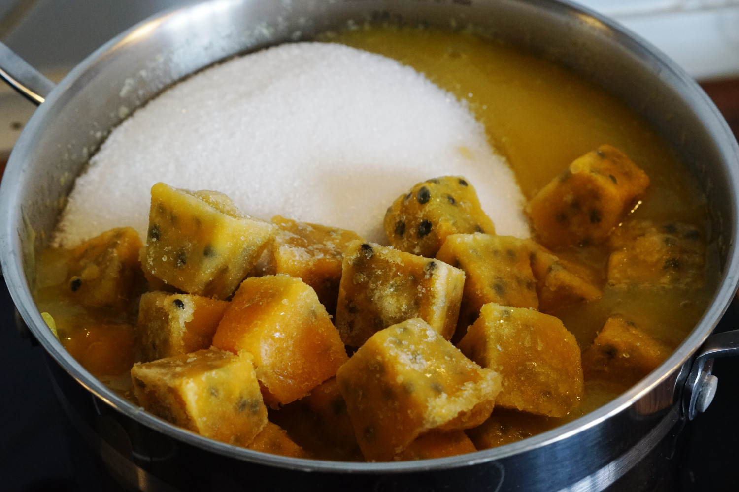 Kom gryden med mango tilbage på kogepladen og tilsæt sukker samt passionsfrugttern.