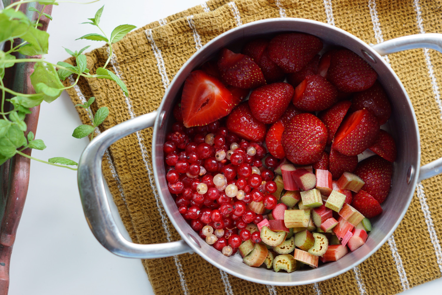 Rødgrød består traditionelt af rabarber, jordbær og røde ribs. Men du kan også komme hindbær i og hvide ribs. Og har du en lille håndfuld solbær og røde stikkelsbær, så kan de også bidrage til en lækker afrunding af smagen. Der er ikke så mange regler, bare tag udgangspunkt i hvad din have byder på.
