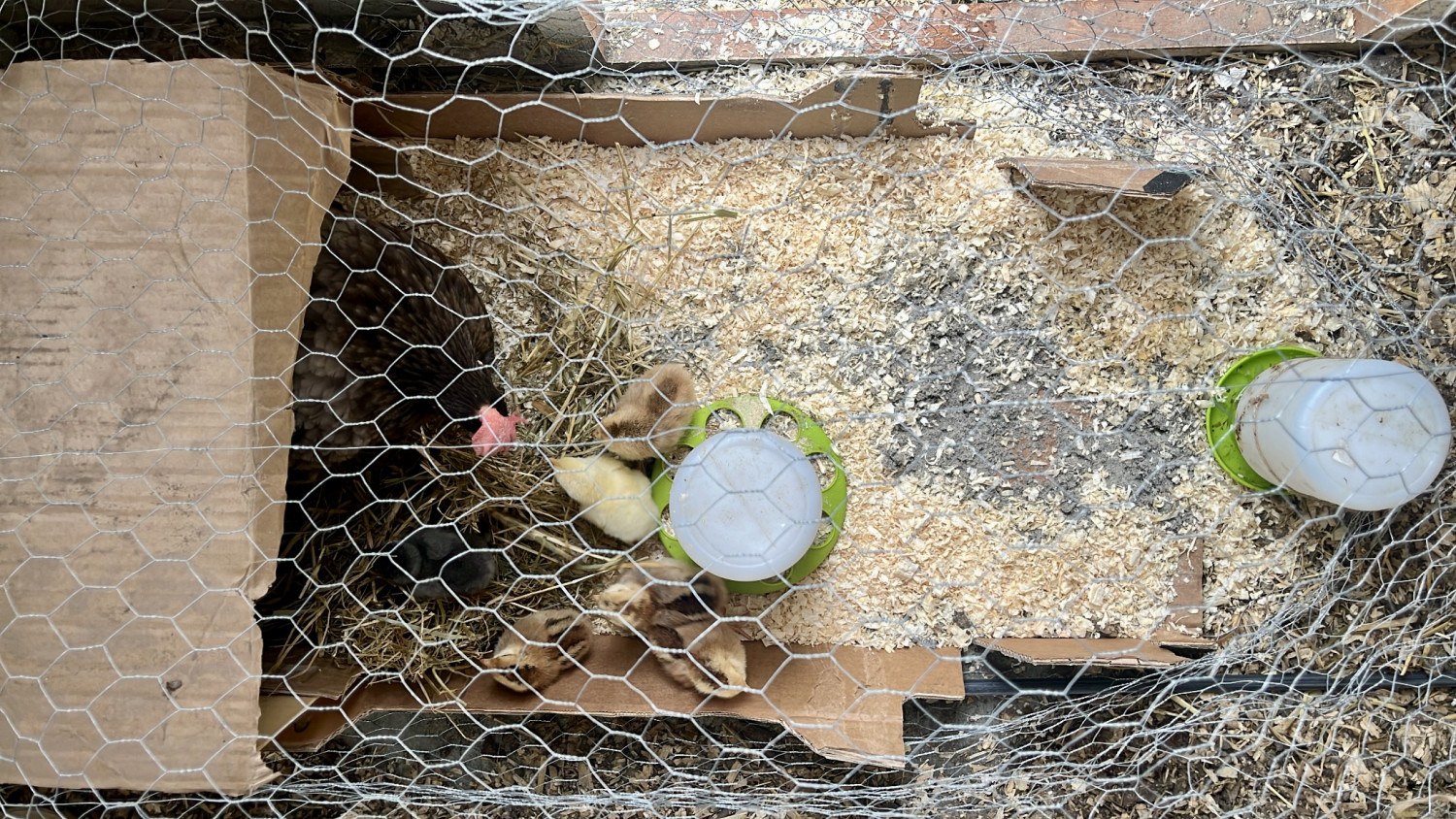 Mit “skrukbur/kyllingegård”. Bag trådnettet har hønen kunne ruge i fred på de befrugtede æg. De første dage efter kyllingerne er klækket er det også et sikkert sted for de små at opholde sig. Fordi det er i selve hønsehuset, så går kyllingerne fra start helt op af de andre høns i flokken. Dette er en stor fordel ift. deres socialisering med hinanden og at kyllingerne accepteres som en del af flokken.