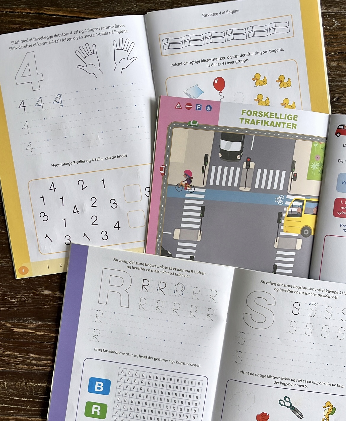 Dette kom helt naturligt ved det ældste barn, da han blev hjemmepasset helt til skolestart, men sidenhen har vi valgt at børnene skal i børnehave de sidste par år inden skolestart. Der bruger jeg også “førskole”, hvor barnet faste ugedag har førskoletid sammen med mig. Normalt bruger vi 20-30 minutter pr. gang, hvor vi så enten har om tal, bogstaver, trafik (hæfterne fremhævet her) eller om natur eller kristendom/katekese.