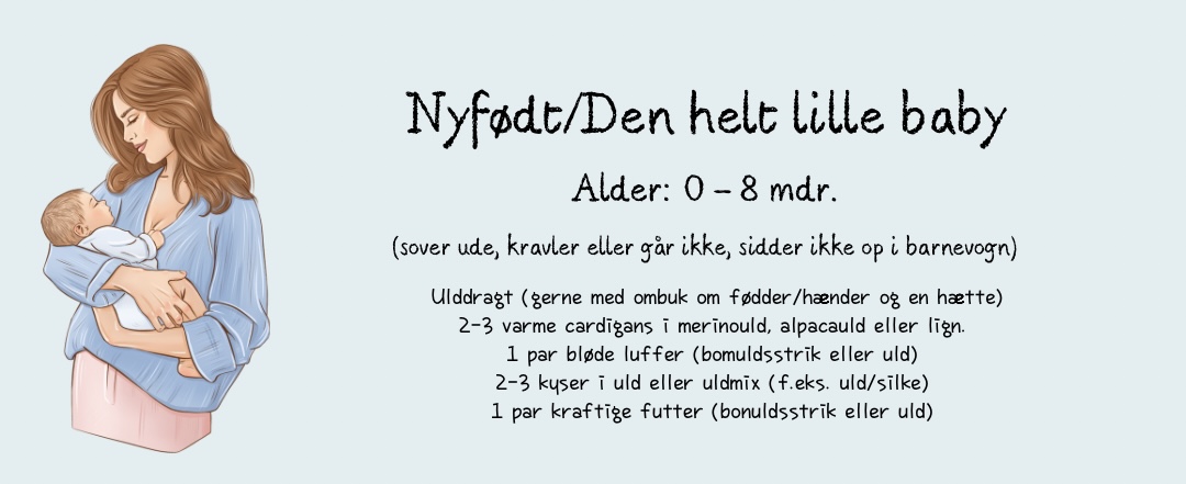Til det helt lille barn (den nyfødte og frem til barnet har en alder, hvor det vil og kan sidde op i barnevognen på ture), der anbefaler jeg først og fremmest overtøj af uld. Det er åndbart og temperaturregulerende. Alt efter temperaturen udenfor, så giver jeg så små børn tøj på lag-på-lag til jeg vurderer de kan holde på varmen. Derfor f.eks. en god cardigan under en ulddragt (udover barnets almindelige tøj) og så dyne, tæppe og dækken på barnevognen. I den alder vil almindeligt (vand- og vindtæt) overtøj hindre varme fuldstændigt i at komme væk fra kroppen, og derfor har jeg aldrig puttet mit nyfødte barn i en flyverdragt i barnevognen. Hold altid øje med barnets temperatur i nakken og følg myndighedernes anvisninger for, hvad der er forsvarligt sove-ude-vejr.