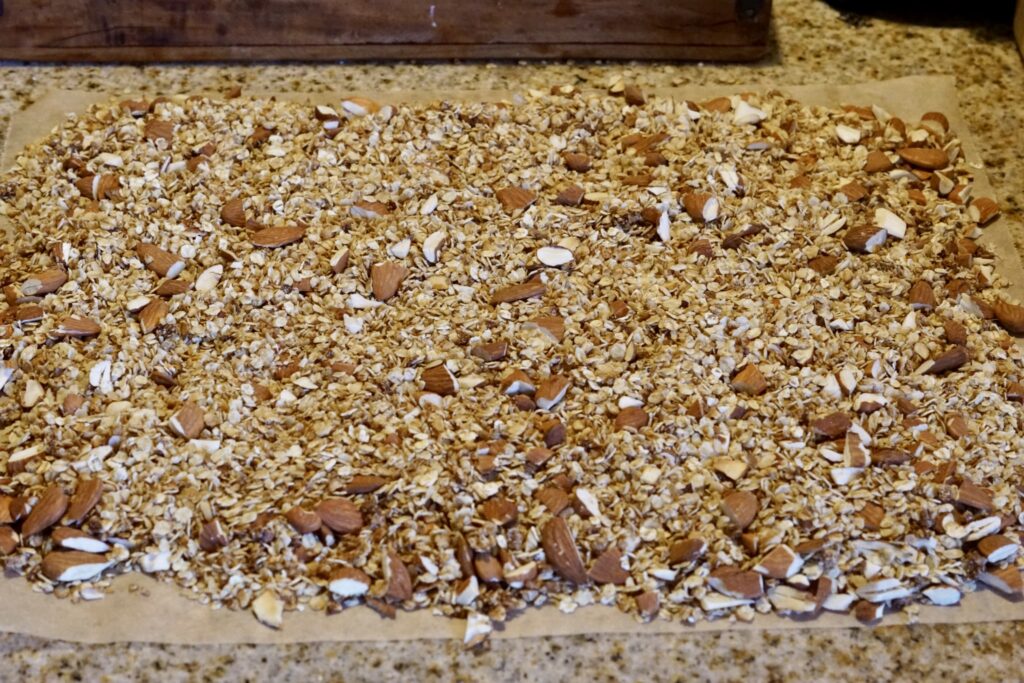 Når du er tilfreds med smagen af din granola (sødme og hvor ristet den er), så tager du den af varmen og hælder den ud på et stykke bagepapir. Fordel den ud over hele bagepapiret og lad den køle af inden du kommer den i en tætlukket beholder.