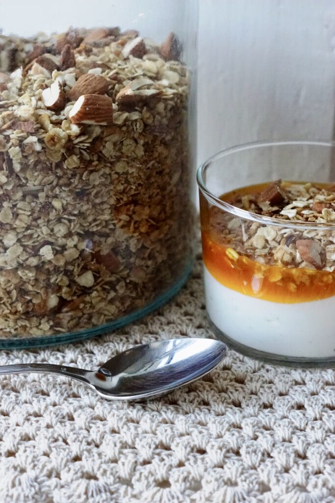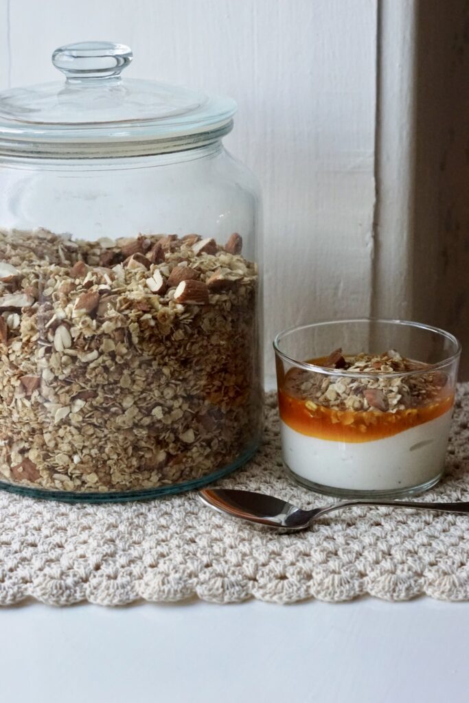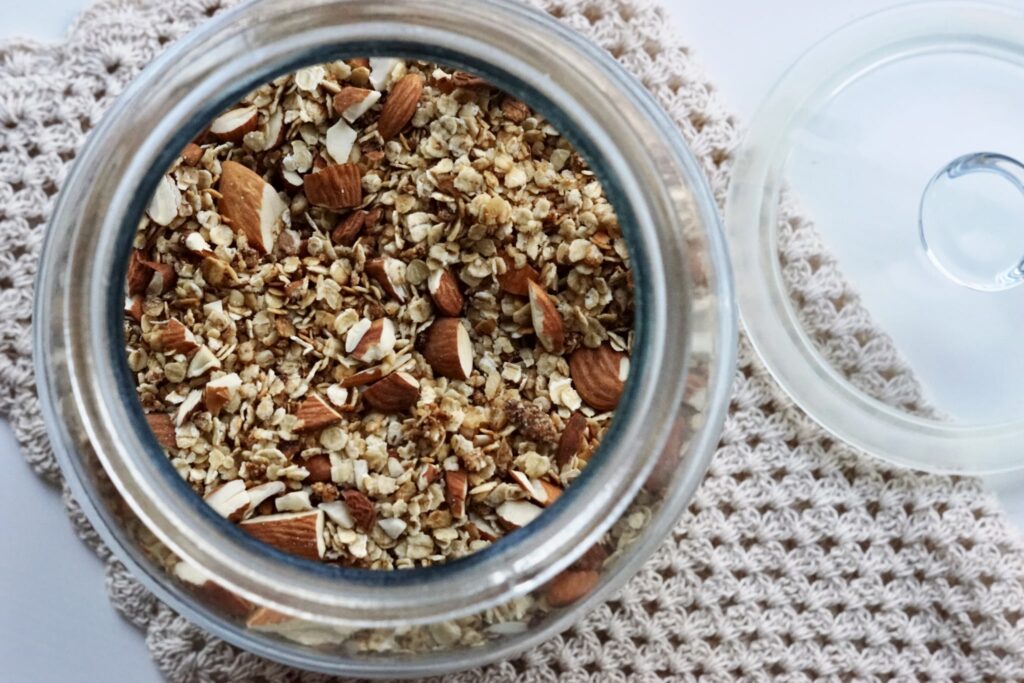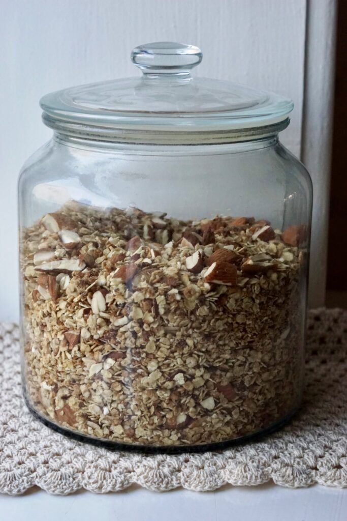 Din hjemmelavede granola kan holde sig i tætlukket beholder ved stuetemperatur (ikke direkte sollys) i 2 uger.