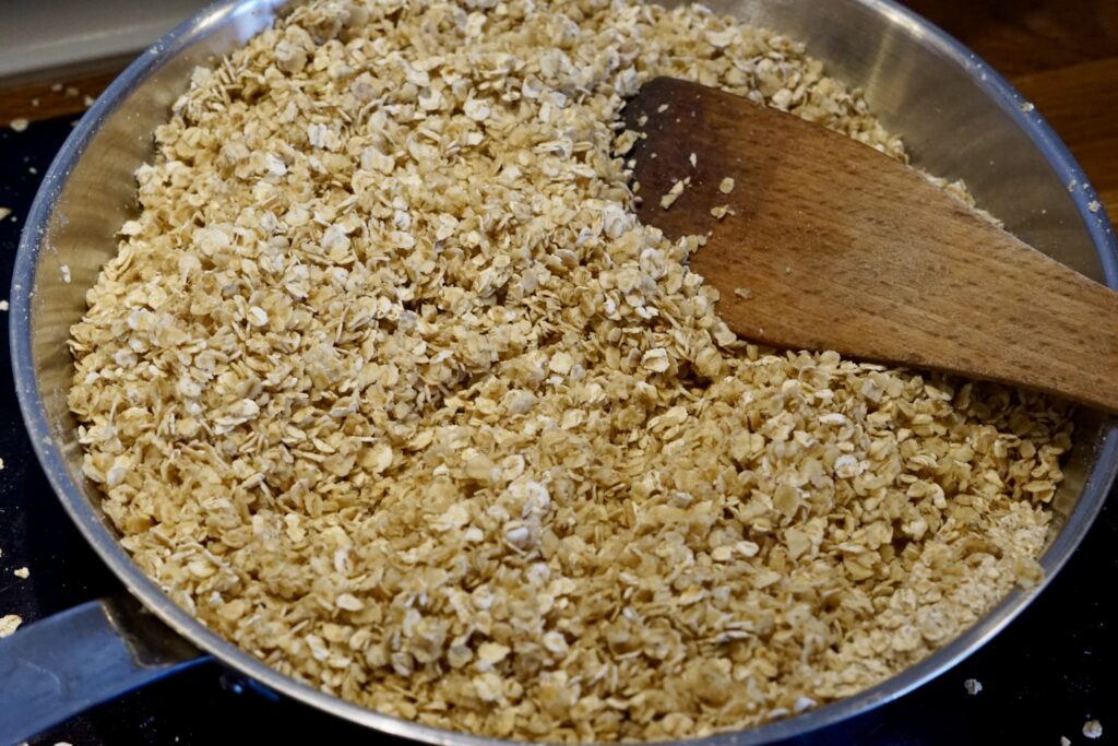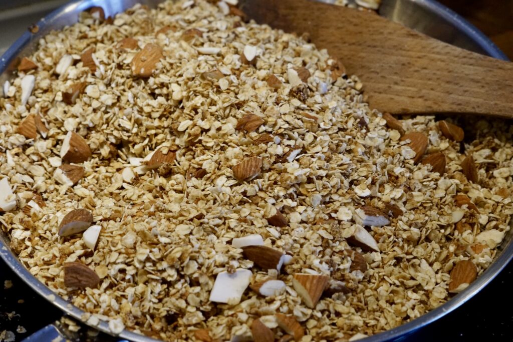 Varm en stor pande op ved medium varme. Det er vigtigt, at panden ikke bliver for varm, for så vil din granola hurtigt brænde på og blive uspiselig. Jeg har mit komfur stående på 4 ud af 9 varmeniveauer.