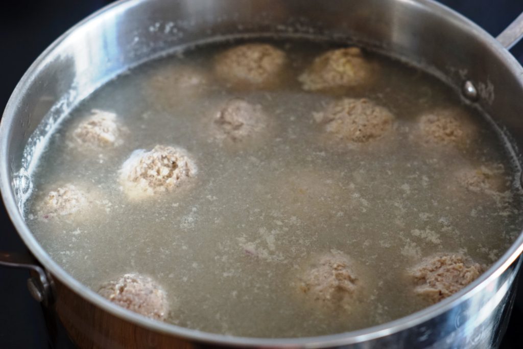 Fyld en mellemstor gryde (3 liter størrelse) med 1 liter friskkogt vand og tænd for varmen under gryden, så vandet lige akkurat småkoger (men ikke buldrer – så vil dine kødboller gå i stykker). Form farsen til kødboller i passende størrelse med en spiseske og din hånd og dump dem forsigtigt ned i det varme vand én efter én. Lad dem småkoge i ca. 15 minutter. Imens kødbollerne er i vandet, så forbereder du sovsen.