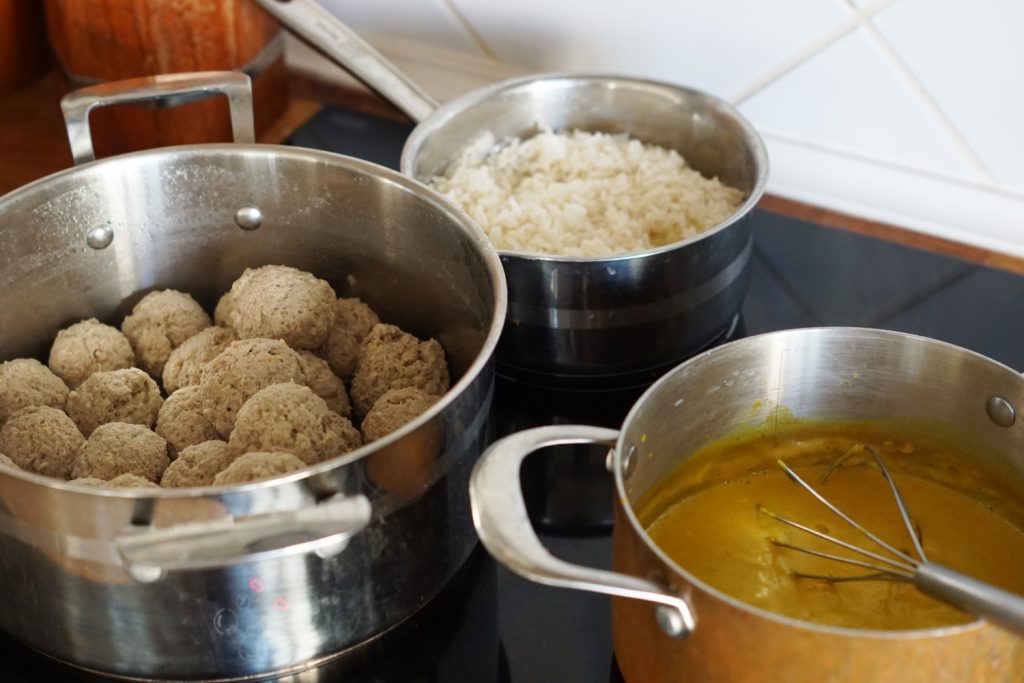 Smag sovsen til med salt. Skru lidt ned for varmen, så sovsen akkurat ikke koger, og tilføj så de færdige kødboller til sovsen og lad dem hvile heri (lad fortsat gryden stå på lav-medium varme) imens risene koges.