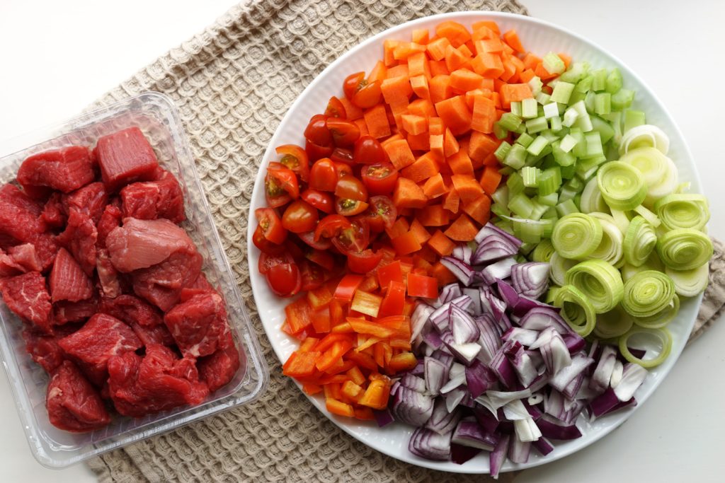Start med at skylle, skrælle og snitte alle grøntsagerne (husk kartoflerne først skal i til aller sidst, så gem dem væk for nu).